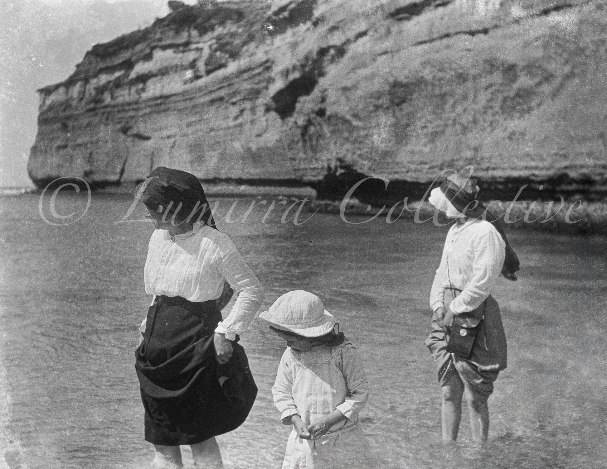 Women and a child at the shoreline of Loch Ard Gorge, Port Campbell, circa 1915. Their attire reflects the modest seaside fashion of the early 20th century long skirts, blouses, and wide brimmed hats offering protection from the sun. Of particular note, the woman on the right carries a camera bag, a rare glimpse of leisure photography at a time when personal cameras were becoming more accessible. The striking limestone cliffs of the gorge rise behind them, framing a moment of everyday joy against one of Victoria’s most dramatic coastal landscapes.
