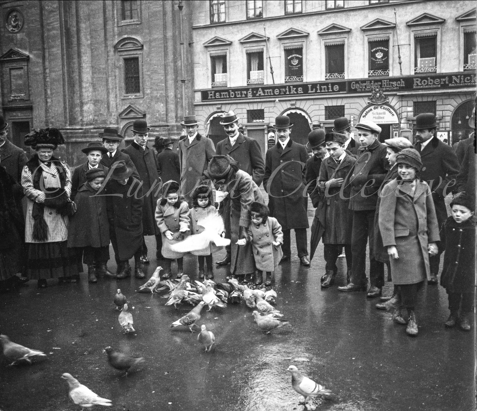 Captured in Munich, Germany in December 1910, this glass negative shows a lively street scene where a crowd of adults and children gathers to feed pigeons. The group, dressed in heavy winter coats, bowler hats, and furs, reflects the fashion of early 20th century Bavaria. Several young girls in matching coats stand at the centre, scattering crumbs, while boys in woollen caps and families look on with amusement.