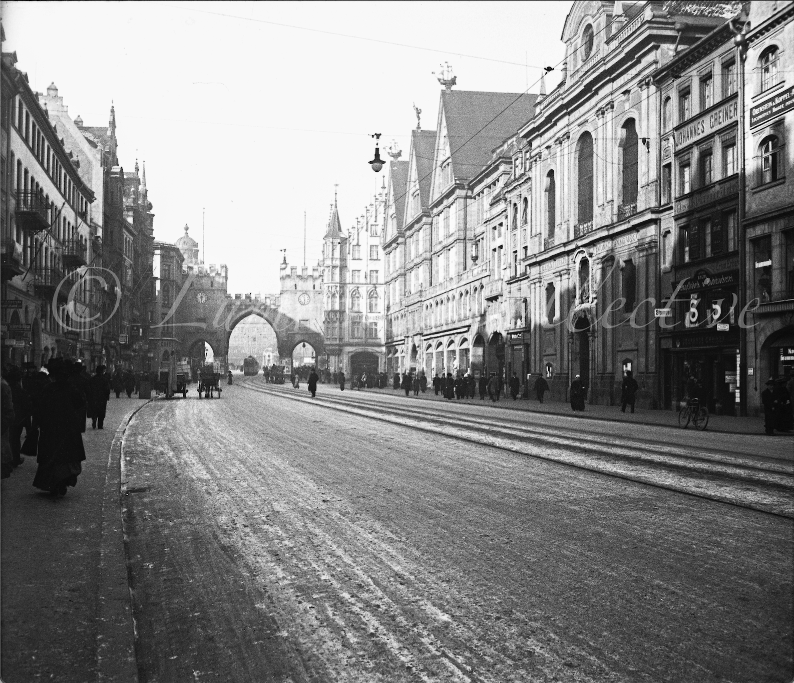 Scanned from a glass plate negative this image captured in December 1910 showcases one of Munichs most historic boulevards, Neuhauser Straße.